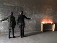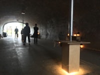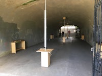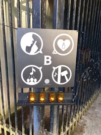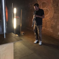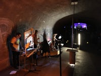 B is a set of three tube chimes within a tunnel for public interaction. Each station held a chime, striking mallet and light source. These instruments served as places where the public could engage in spontaneous music making and gathering spaces. Live bands were invited to perform every weekend in conjunction with this public music sculpture.